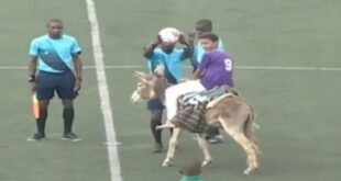 تداول رواد مواقع التواصل مقطع فيديو لأحد الأشخاص يدخل ملعبا على ظهر حمار في نهائي دوري دولة إفريقية. وأبان الفيديو شخص يدخل ملعبا على ظهر حمار ويسلم الحكم الكرة. وأثارت الواقعة موجة من ردود الأفعال الساخرة. واستنكر مغردون استخدام هذه الطريقة لتسليم الكرة. ونشرت الصفحة الرسمية لشبكة “ÁFRICA FUTBOLERA قائلة “ففي الوقت الذي تقوم به الكثير من الدول بتسليم حكم …