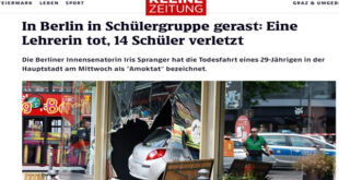 تلاميذ من ولاية هيسن وسط البلاد في رحلة مدرسية إلى العاصمة برلين، تعرضوا لهجوم بالدهس في أحد الشوارع، ما أدى لمقتل معلمة وإصابة العديد من التلاميذ. والشرطة تعلن العثور على “ملصقات” عليها عبارات عن تركيا داخل السيارة. نفت وزيرة داخلية ولاية برلين الألمانية ايريس شبرانغر وجود خطاب اعتراف داخل سيارة المشتبه به في هجوم الدهس الذي وقع قبل ظهر اليوم …