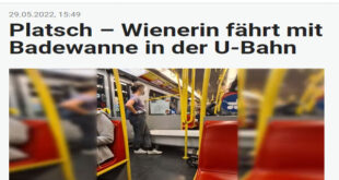 رصد أحد ركاب مترو الأنفاق رقم 4 ، ويسمى أليكس وجود بانيو أستحمام كبيرة الحجم داخل عربة مترو الأنفاق في فيينا وسط زهول وأستغراب الراكبين ، فى ظل غياب تام لرجال الأمن ومشرفى محطات المترو . نشرت اليوم صحيفة هويتة النمساوية اليومية ، صورة مثيرة للسخرية، تظهر بانيو إستحمام كبير الحجم داخل عربة مترو الأنفاق رقم 4 المتجهة إلى هيلجن …