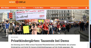 نظم الآلاف من العاملين في دور حضانات الأطفال الخاصة “رياض الأطفال” مظاهرة حاشدة ، اليوم الثلاثاء الموافق 29 من مارس ، بوسط العاصمة النمساوية فيينا ، يطالبون فيها بظروف عمل أفضل وزيادة الأجور وعمال مهرة قادرين على تحمل المسئولية ، فضلا عن الاحتجاج على ارتفاع نفقات المعيشة تجمع المتظاهرون في ميدان فوتيف كيرخا بالحى التاسع ، وجابت المظاهرة شارع الرنج …