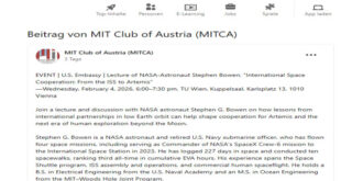 اقرأ المزيد »رائد فضاء من ناسا يحاضر في فيينا حول مستقبل التعاون الدولي في الفضاء