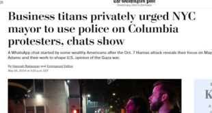 كشف تحقيق استقصائي نشرته صحيفة واشنطن بوست الأمريكية، الخميس 16 مايو/أيار 2024، عن الدور الذي لعبته مجموعة من المليارديرات وعمالقة الأعمال في الولايات المتحدة، في التحريض والقمع الذي تعرضت له المظاهرات في الجامعات. هذا التحقيق اعتمد على تسريب وصل الصحيفة من مجموعة واتساب، وأظهرت فيها المحادثات أن رجال الأعمال حثوا بشكل خاص عمدة مدينة نيويورك على استخدام الشرطة ضد المتظاهرين في جامعة …