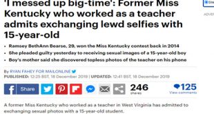 قضت محكمة أمريكية بسجن ملكة جمال ولاية كنتاكي السابقة بالسجن لمدة عامين، بعد أن أقرت بأنها مذنبة في إرسال صور عارية إلى مراهق في الخامسة عشر من عمره.وأقرت رمزي بيثان بيرس، مدرسة العلوم السابقة، الفائزة بلقب جمال كنتاكي في عام 2014، بإرسال صور عارية إلى الطالب، حيث اعترفت بالذنب في تهمة واحدة هي حيازة مواد تصوير لقاصرين في سلوك جنسي …