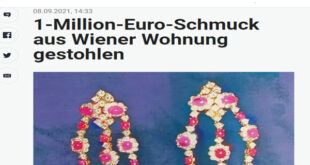 تقدمت أمرأة نمساوية تبلغ من العمر 76 عاماّ ، ببلاغ إلى الشرطة ضد مجهولون يفيد بسطو لصوص على شقتها بالحى التاسع عشر أثناء إقامتها بالخارج ، وحسب بيان الشرطة فإن السيدة عند رجوعها من الخارج وجدت شقتها في حالة مدمرة تماماً، وسرقة مجوهرات بقيمة مليون يورو من المجوهرات والأحجار الكريمة تحتوى على قطع من الياقوت والزمرد والماس والذهب وحسبما نشرت …