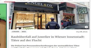 شهدت العاصمة النمساوية فيينا صباح اليوم الخميس الموافق 5 من أغسطس 2021 عملية سرقة لمحل ذهب في قلب فيينا بالحى الأول في شارع ” Spiegelgasse” فقد رصدت كاميرا مراقبة داخل محل ذهب ، عملية سطو مسلح نفذها لصان ملثمان في حوالى الساعة الحادية عشر والنصف – قاما خلالها بإكراه العاملين داخل المحل على تسليمهما محتويات الخزينة من المشغولات الذهبية حيث …
